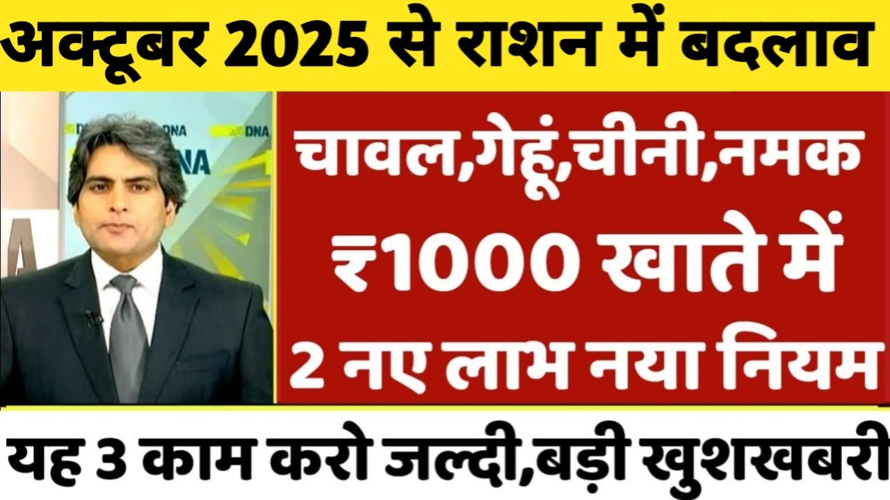 Ration Card New Update:अक्टूबर 2025 से राशन कार्ड पर 4 नए लाभ मिलने शुरू हो जाएंगे, जो गरीब, मध्यमवर्गीय और जरूरतमंद परिवारों के लिए बड़ी राहत और सुविधाएं लेकर आएंगे। इन नए फायदों के तहत हर राशन कार्ड धारक को प्रति माह ₹1000 की आर्थिक सहायता सीधे बैंक खाते में मिलेगी, जिससे घरेलू खर्चों में मदद मिलेगी।